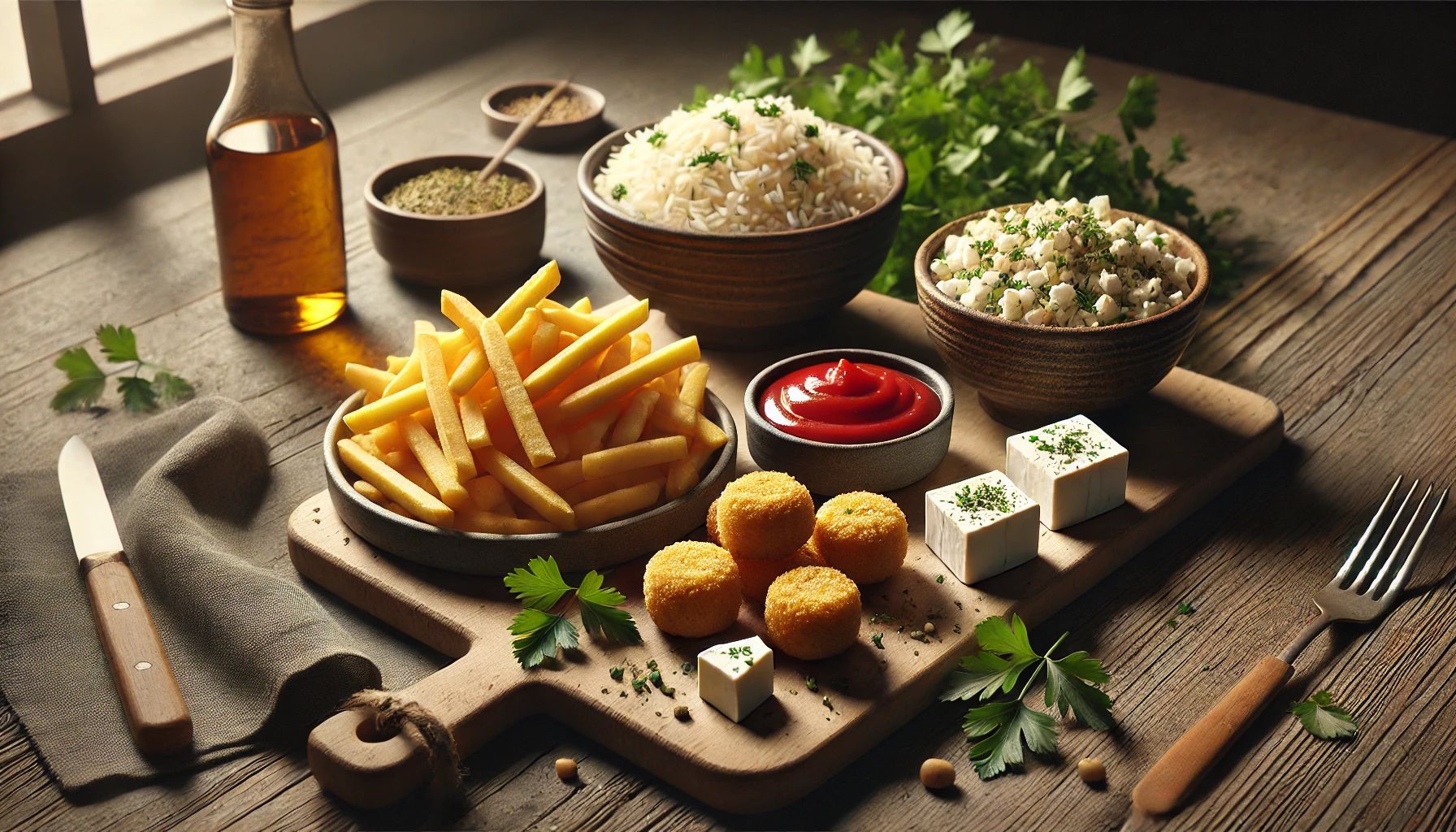 Nach Wahl: Tzatziki, Ketchup, Mayonaise, Cocktail-Dressing, Süß-Sauer-Sauce, Scharfer Sauce, BBQ-Sauce, etc.